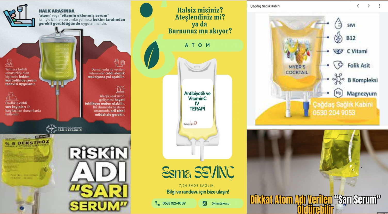 Öncelikle Sağlık Bakanlığı yetkililerinin okuması için sosyal medyada yayınlanan bir reklamı görelim:’’Atom serum da neler var? (https://acilozelhemsire.com/). Sizlerin ihtiyacına yönelik olarak düzenleme yapılır fakat genel olarak aşağıdaki vitaminler eklenir. Enfeksiyonlarda fazlasıyla ihtiyacını hissettiğimiz B1, B6, B12, B5 ve C vitaminleri, Enfeksiyonun şiddetini azaltmak için antienflamatuvar ilaçlar,