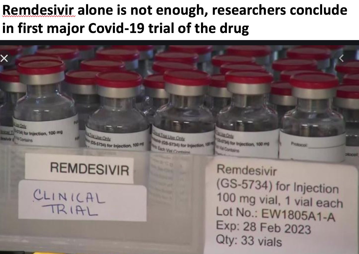 Covid-19 tedavisi için kandırmacalar birbirini kovalıyor. Şu ana kadar hiç bir ilaç covid-19 da tam etkili olmamıştır. İlaç firmaları ise fırsattan faydalanmak için her türlü yola başvurmakta, hatta ülkeler bunun için yarışmakta. Hidroksiklorokinin etkisi bulunması, koruyucu etkisi gösterilmemiş olmasına ve tüm ciddi, ölümcül yan etkilerine rağmen bir çok ülkede kullanılmakta. Favipiravir'in etkisiz olduğunun ve teratojenik (sakat doğumlara sebep olacağı) bilindiği halde kullandırlmakta (Japonya Türkiyeye hibe ediyor). Bunların dışında onlarca ilaç ve kimyasal madde deneme yanılma yöntemi ile insan hayatı hiçe sayılarak, onu kurtarma amacı ile kullanılmakta. Bunlar içinde en popüler olanlardan birisi Gilead firması tarafından hepatit C tedavisi için geliştirilen Remdesivir fırsattan istifade Covid-19 ilacı oluverdi ve Gileadın inanılmaz lobi faaliyeti ile (son 45 ayda lobi harcamaları 4 misli artmış) ilaç önce FDA de acil durum kullanma izni almış, daha sonra NIH tarafından plasebo kontrollu, çift kör klinik araştırma başlatılmıştır. Araştırma başladıktan bir süre sonra etik dışı olarak araştırmanın çift körlüğü kaldırılmış ve basına ilacın etkili olduğu yalanı sızdırlmıştır. ABD ve dünyada bir çok bilim adamı bununu protesto etmesine karşın araştırma devam etmiş ve sonuçlar tüm kandırmacası ile beraber bu hafta NEJM da yayınlanmıştır. Makale ekte takdim edilmiştir.