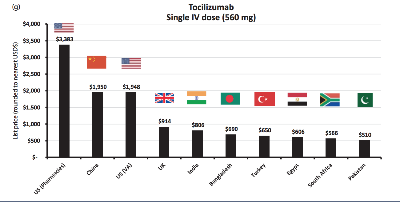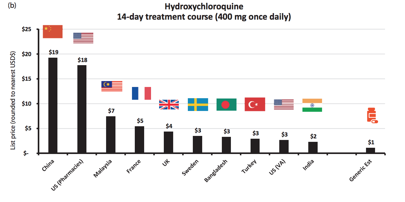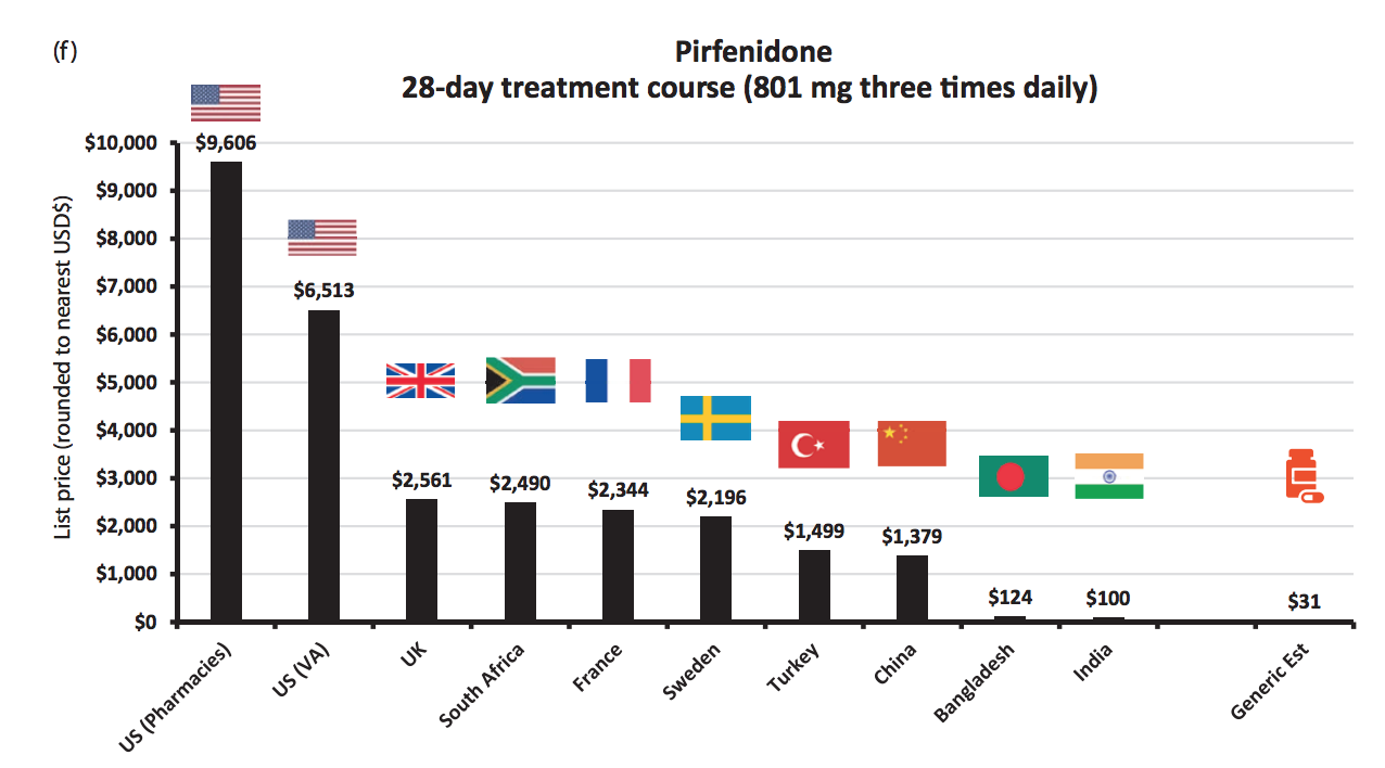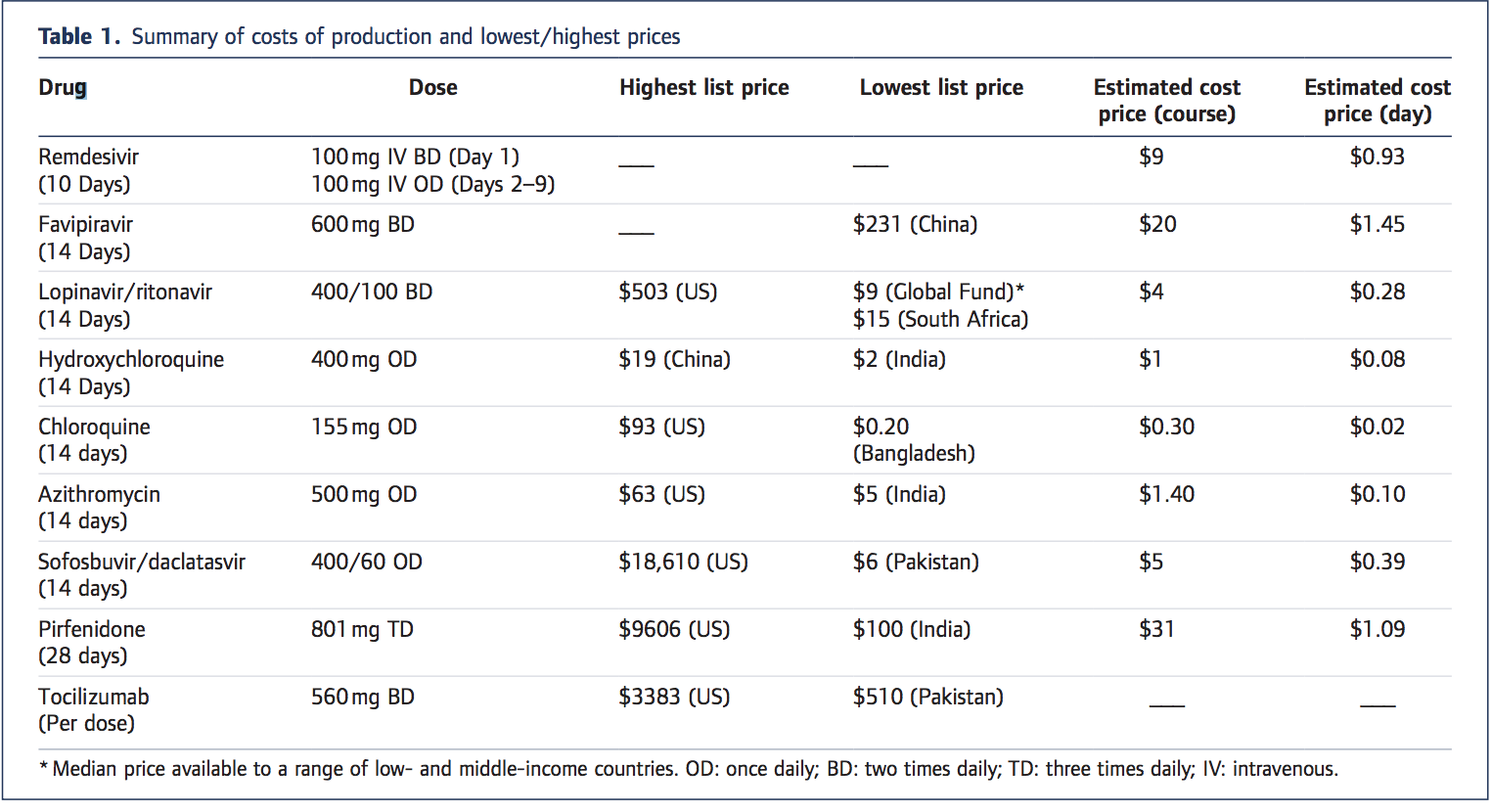 Sonuçlar: Minimum tahmini üretim maliyetleri remdesivir için 0.93 $ / gün, favipiravir için 1.45 $ / gün, hidroksiklorokin için 0.08 $ / gün, klorokin için 0.02 $ / gün, azitromisin için 0.10 $ / gün, lopinavir / ritonavir için 0.02 $ / gün, 0.39 $ / gün sofosbuvir / daclatasvir için ve pirfenidon için 1.09 $ / gün. Üretim maliyetleri tedavi süresi başına (10-28 gün) 0.30 $ ile 31 $ arasında değişmektedir. Bu ilaçların mevcut fiyatları, özellikle ABD'de, üretim maliyetlerinden çok daha yüksekti.