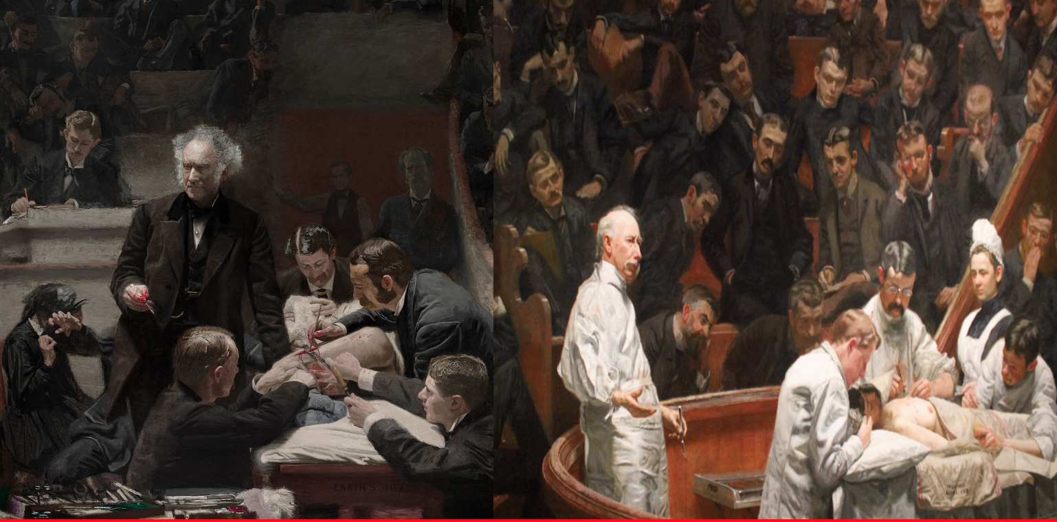 Thomas Eakins, 1875'te tartışmasız Amerika'nın en büyük resimlerinden biri olan "The Gross Clinic" ( şekil 1 ) adlı tabloyu yarattı. Resim, Philadelphia'daki Jefferson Tıp Fakültesi amfi tiyatrosundan Dr. Samuel Gross ve yardımcılarının (hepsi siyah resmi kıyafetler giymiş) genç bir adama bacak ameliyatı yaptığını gösteren bir sahneyi tasvir ediyor.