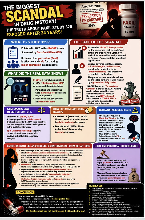 Modern pharmacology is regarded as one of the most powerful tools of evidence-based medicine. However, several examples that have emerged over the past three decades demonstrate that clinical research is subject not only to methodological limitations but also to serious issues related to data analysis, reporting, and publication processes. In this context, the case of Study 329 related to paroxetine (Paxil) stands out as one of the most striking examples of corruption in the pharmacological literature. As I have emphasized in my previous work, the problem is not merely the publication of a flawed study; rather, the real issue is that such a study continues to exist in the literature for years and continues to influence clinical decision-making (http://www.klinikfarmakoloji.com/search/node?keys=paxil)