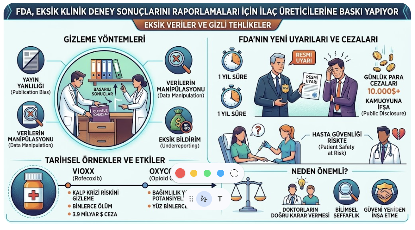 FDA'nın (ABD Gıda ve İlaç Dairesi) klinik araştırma sonuçlarını bildirmeyen vey an etkileri saklayan ilaç firmalarına karşı başlattığı bu hamle, tıbbi şeffaflığı artırmayı ve bilimsel literatürdeki "yayın yanlılığını" (publication bias) engellemeyi amaçlayan geniş kapsamlı bir operasyondur. Nisan 2026 itibarıyla konuyla ilgili öne çıkan detaylar şöyledir: